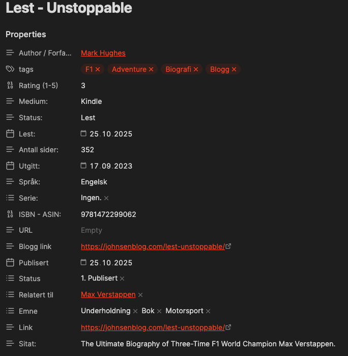 Første halvdel av boken var etter min mening svært god. Da jeg la den fra meg, gledet jeg meg til å fortsette. Men siste del ble ganske annerledes – mer som en oppsummering, løp for løp, av de siste årene. Så, er du hardcore Verstappen-fan, les hele! Hvis ikke, lån den og les første halvdel – den er verdt det alene.