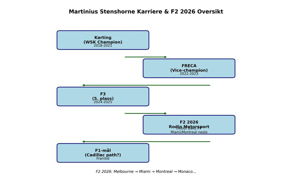 Spesielt spennende for oss nordmenn: 20-åringen Martinius Stenshorne fra Hokksund kjører sin første fulle F2-sesong med Rodin Motorsport. Den talentfulle junioren, som ble nr. 5 i F3 i fjor, debuterte allerede i Baku og viste toppfart med P7 i kvaliken – til tross for uflaks i løpene. Stenshorne, med bakgrunn som WSK-kartingmester og FRECA-vicechampion, er et hett navn på veien mot F1. Hans familiearv fra rallyførere som far og bestefar gir ekstra krydder til historien.