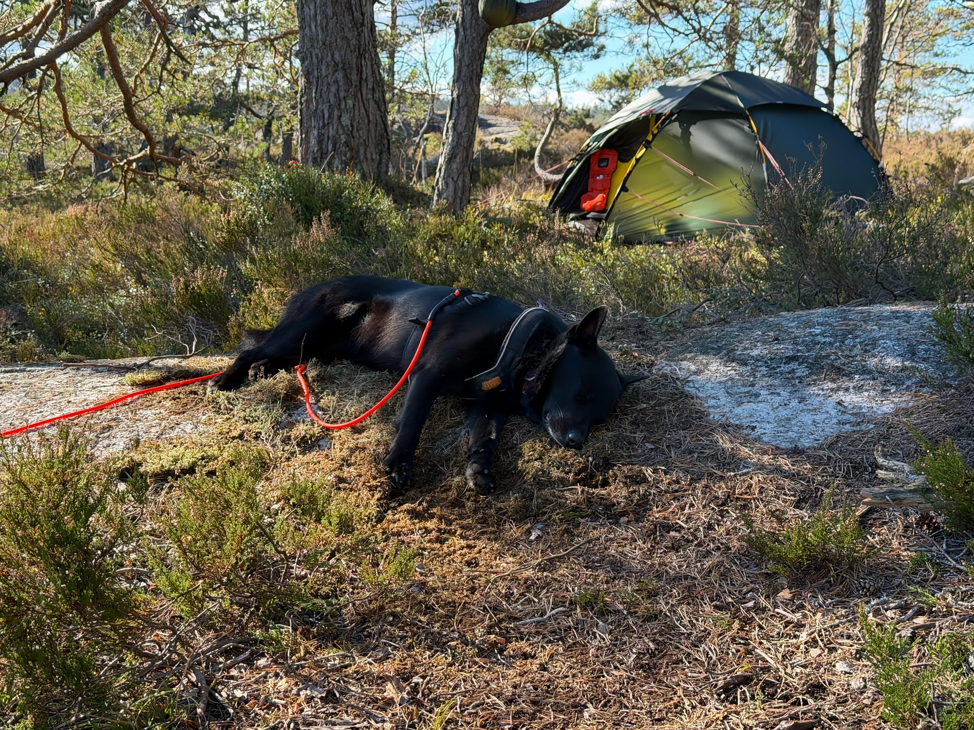 I halvsju tiden eller der omkring så ble det svare leven uten like utenfor teltduken, en skulle tro en våknet opp midt i en orreleik. Det var full krangel, kjefting og delvis slåssing mellom flere fugler. King Kenny er alltid godt tjoret fast i selve teltet og i pluggen ved inngangen på han sin side, vi har hver vår side i denne typen telt. Plutselig så greide han ikke å holde seg lenger, spenningen ble for stor og han og tok ut på skogsfugl jakt, det røkka noe vilt i teltet da linen tok slutt og den godeste Kenny fikk seg en uventet bråstopp. De fleste av fuglene forsvant med det samme han viste seg, men to av de ble sitte igjen å kjekle en stund til, godt utenfor rekkevidden til Kenny. Jeg viste meg ikke og laget ikke lyd, da hadde jo alle forsvunnet med det samme, men det var en fin opplevelse å ligge i teltet å høre på, å se de for seg rett og slett.