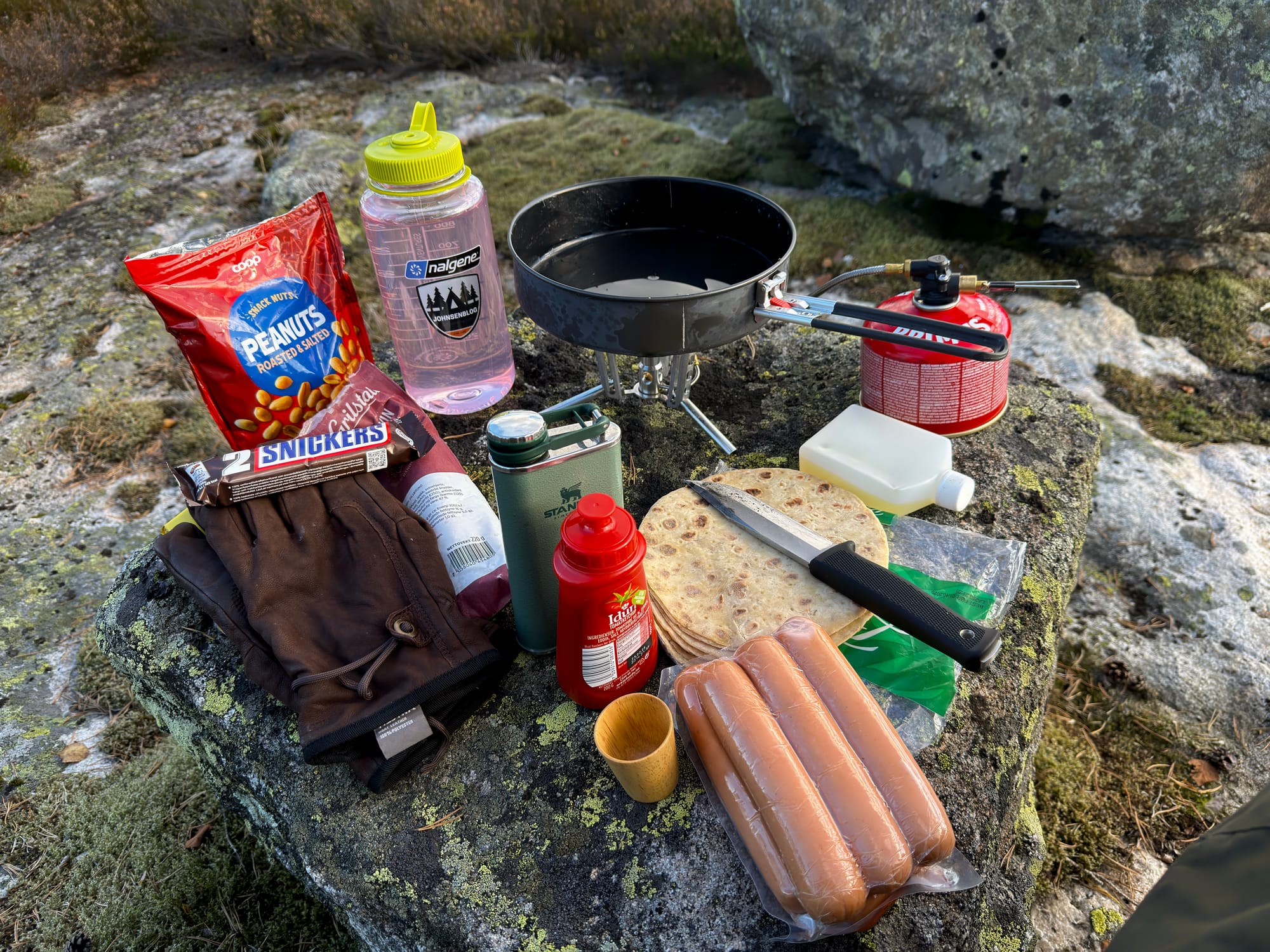 Dagens middag ble Gilde Ostepølse i lompe, det er 6 pølser i pakken, det er jo litt i overkant, så også denne gangen ble det delt broderlig. Jeg pleier ikke å ha fersk mat to dager på rad på tur, men siden det var meldt 4 °C på nettene og maks 10-12 °C på dagen så tenkte jeg at det ville gå bra, og det gjorde det. Etter all maten, 2 halvlitere og et glass rødvin (det var alt som var igjen) så ble jeg så segen at jeg rett å slett tok en tidlig kveld. I åtte halv nitiden så satte jeg mobilen i flymodus og gikk å la meg i teltet for å lese, det ble ikke så mye lesing før jeg kveldet og sovnet som en stein.